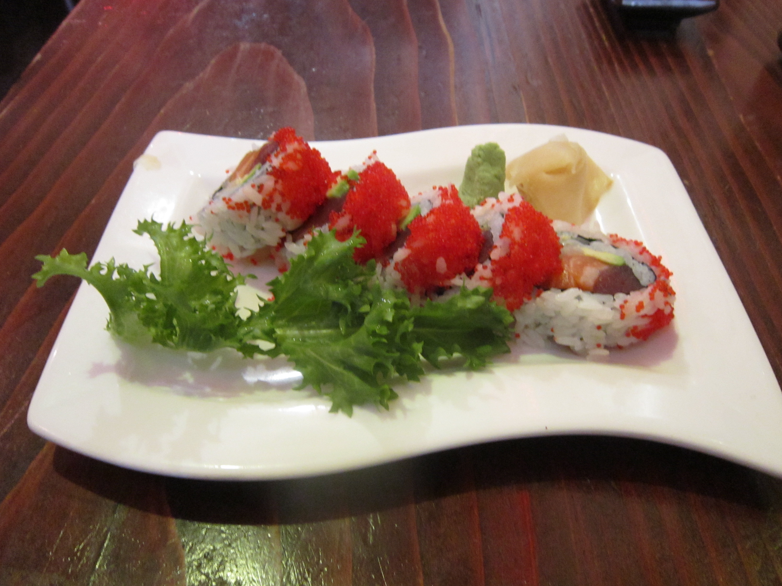 When we say that sushi uses "raw" fish, this is only partially true. The raw fish is saltwater fish (like tuna), but freshwater fish, like salmon, which may contain parasites, is indeed cooked, although it is cold when it gets to you, the diner. Other kinds of fish that are served at Akina include fluke, striped bass, and mackerel. In addition to "normal" tuna, you may chose to eat spicy tuna, tuna belly ("toro"), or yellowtail. You may choose smoked salmon or salmon toro as well as "normal" salmon. Also served are squid, surf clam, eel, king crab, shrimp, and sea urchin. Rolls may be simple, just seaweed, rice, and one kind of fish, or very complex, using a variety of seafood, vegetables, etc. Fish roe (think "caviar") are also served.